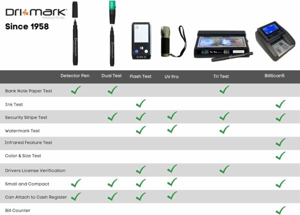 Each pen is made by Dri Mark in the U.S.A. and has 3 time more ink than many competitors, meaning that they last longer and you can count on them to help protect you. Play it safe and demand Dri Mark.